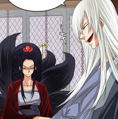 Baek-Son has long white hair and wears blue robes. He has numerous white tails sticking out from behind.