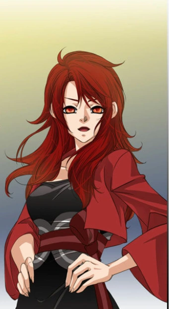 Mi-Hyang is a red haired, five-tails fox. She has red eyes, a red coat, a black strapless dress that ends mid-thigh with a red cloth tied around It, and red high heels. She likes Ryo-Eun.